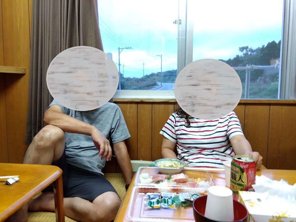 そこで港のすぐそばにある「とび吉」でお刺身やお寿司などを入手して、「フェリー欠航残念会」を開くことにしました。ネーミングセンスがgoodですね。