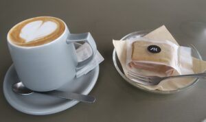 ラテアートもかわいらしく、ほろ苦いコーヒー味のパウンドケーキもおいしかったです。
