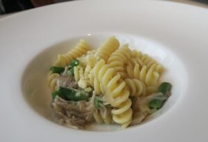くるくるのショートパスタに生ハムときのこのソースを絡めてあります。生ハムの塩気を考えて味を付けてあるので、バランスがとてもいいです。
