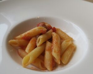 トマトソースのパスタです。フレッシュなトマトをソースにしていると思いますが、酸味が強すぎないので、イタリアのトマトを使っているのかもしれません。トマトが苦手な私ですが、こちらはおいしく頂きました。