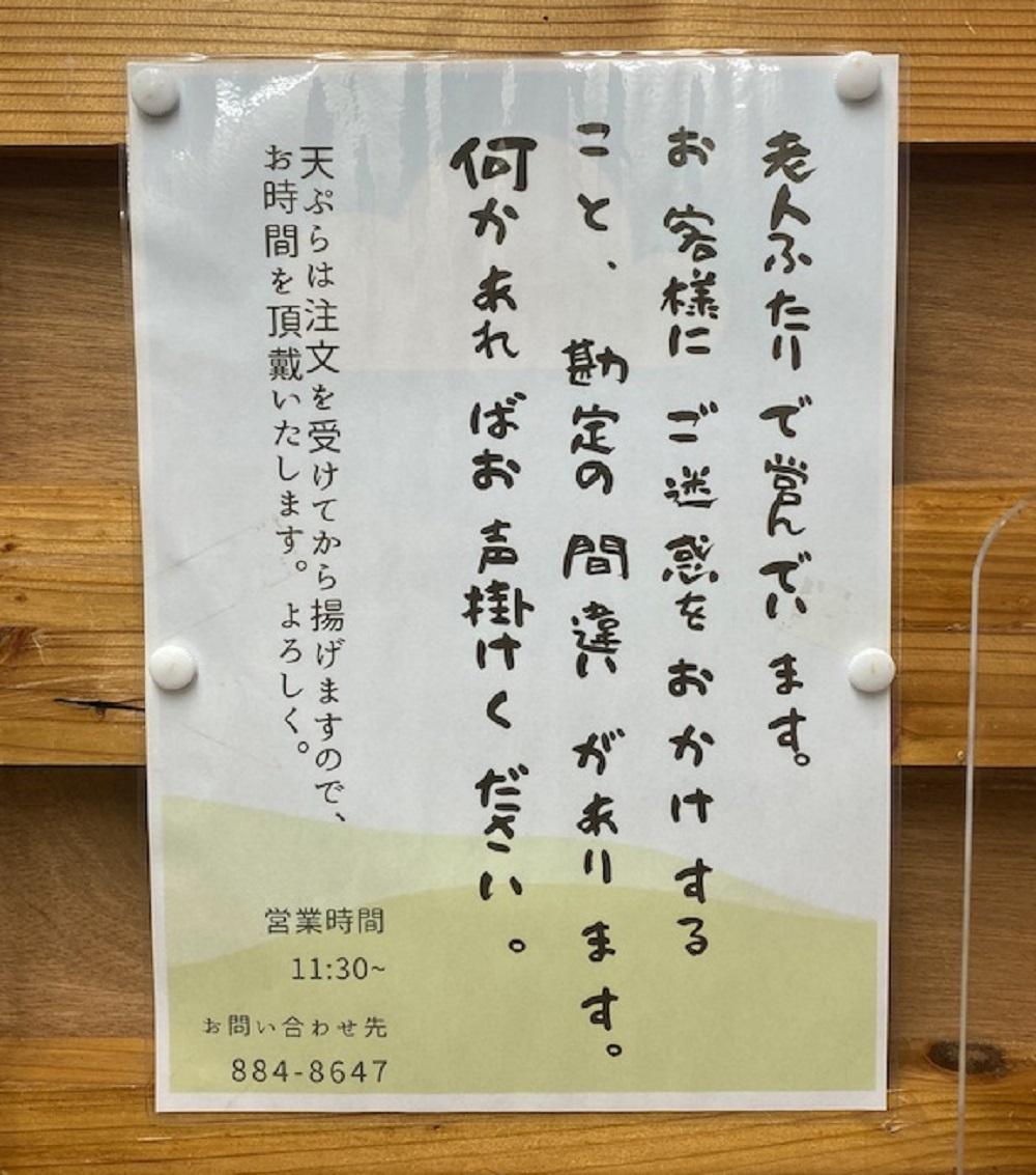 壁の貼り紙を見ていると「老人ふたりで営んでいます。お客様にご迷惑をおかけすること、勘定を間違えることがあります。なにかありましたら、お声がけください。」って書いてあります。