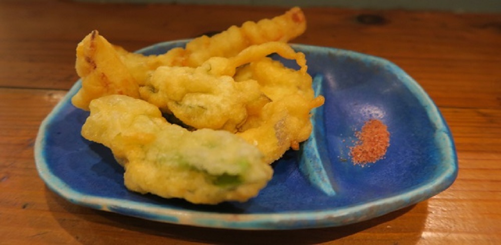 シカクマメ、うりずん豆、えび、ナスなどを衣がフカフカの沖縄天ぷらに仕上げてあります。塩を付けて食べると食材のおいしさが引き立ちます。