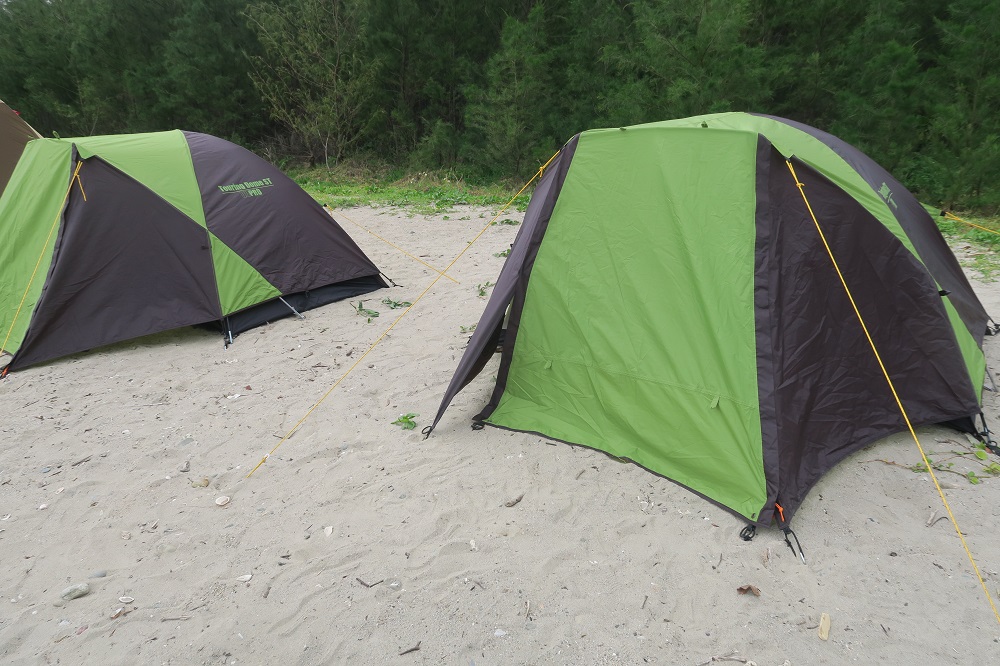 インストラクターさんに教えていただきながら一緒にテントを建てました。思ったより、あっという間に出来ました。砂浜だったのでペグを差し込むのも簡単だったからかもしれませんが。