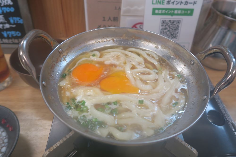 シメも注文できます。うどんをお願いしました。少し甘めの鍋つゆとうどん、卵がからんでお腹も満足しました。