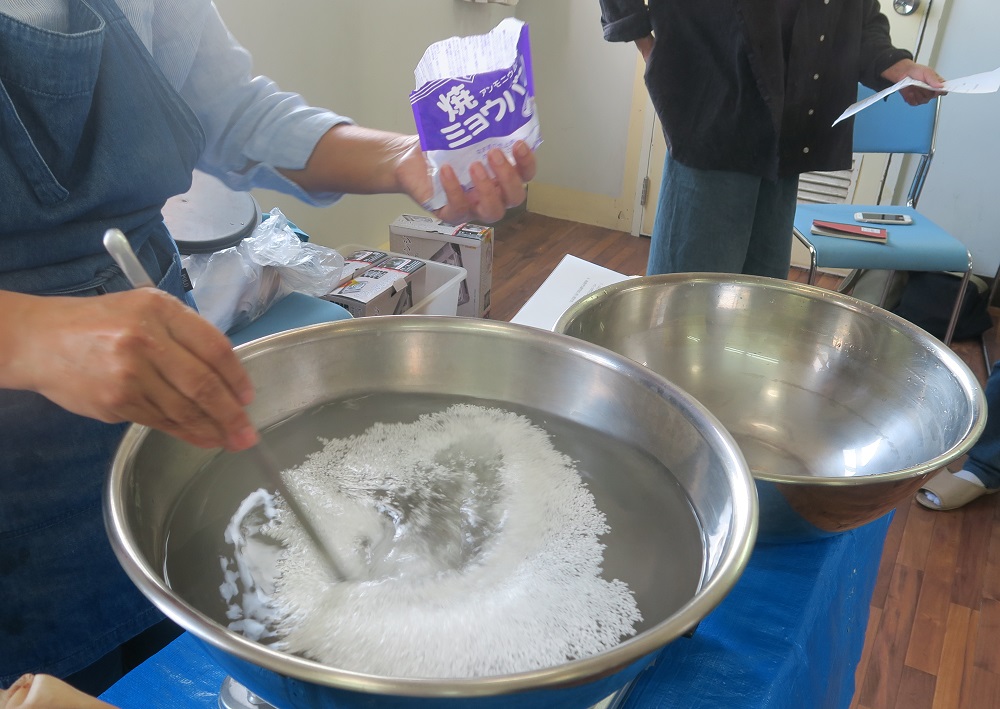 こちらはミョウバンを溶かした媒染液です。ミョウバンとはお漬物の色鮮やかにしたり、栗きんとんのきんとんの色を鮮やかにするときに用いられるものです。