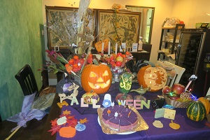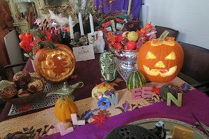 魔女さんが作られた祭壇です。かぼちゃや冬瓜をくり抜いてランタンにしてあります。