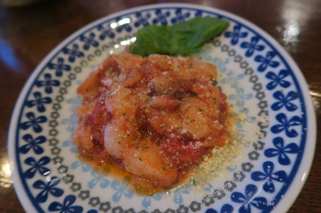 タコをトマトソースで和えてあります。トマトは苦手な私ですが、火が通れば好きです。