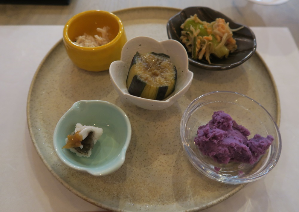 おばんざいの盛り合わせです。紅いものクリームサラダ、シャケとネギ、梅水晶、ナス、鱧の湯引き。京料理らしく出汁が効いています。この点が関東の料理との違いだなと思います。鱧は初めてかもしれません。あっさりした白身に梅肉がぴったりでした。