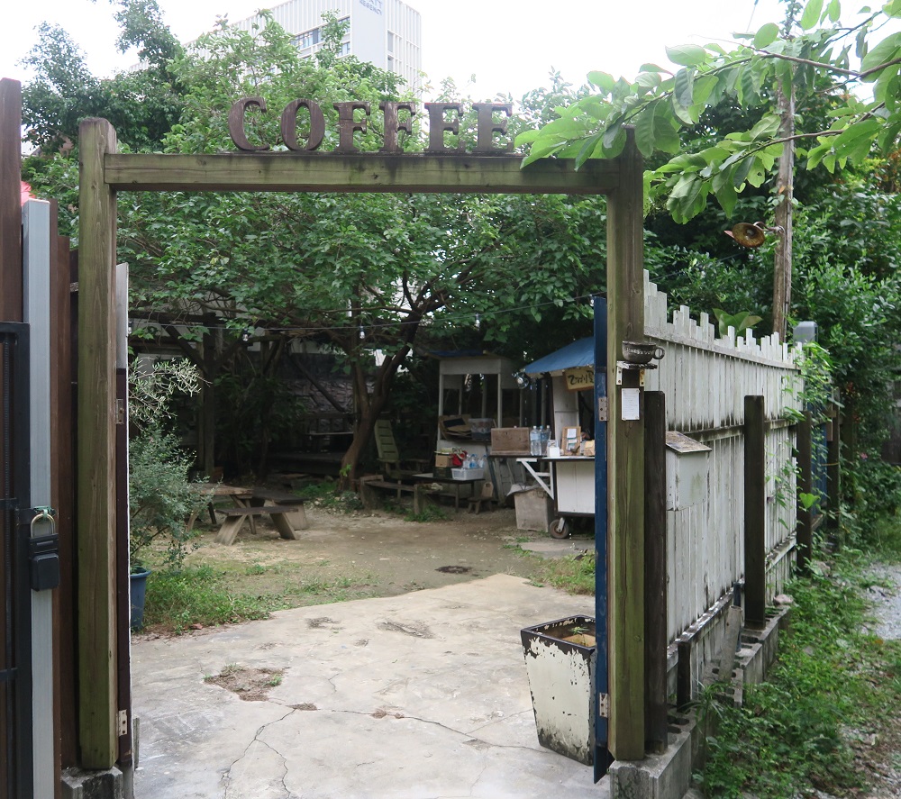 国際通りから脇道を進み、さらに細い路地を入ると突然開けて、珈琲屋台ひばり屋の門が見えます。