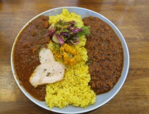 カレーはスパイスがたっぷり使ってあるのですが、辛くありません。パウダータイプのスパイスだけでなく、ホールタイプのスパイスも使っているので、口の中で弾ける感じが楽しいです。