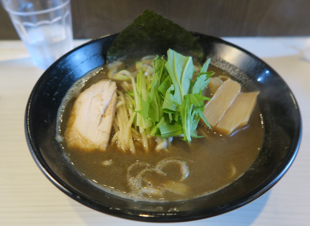 トッピングはチャーシュー、メンマ、ネギ、ノリ、水菜。水菜は珍しいと思いますが、濃厚なスープにさっぱりした水菜がいいアクセントになっていました。麺は細めのストレート麺でした。麺にスープを絡めたいなら、ちぢれ麺のほうが良さそうですが、しつこくなるのかもしれません。これはこれでいいのだろうと思いました。