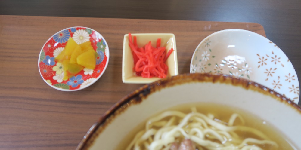 テーブルの上のお水を飲みながら、少し待つと沖縄そばが運ばれてきました。