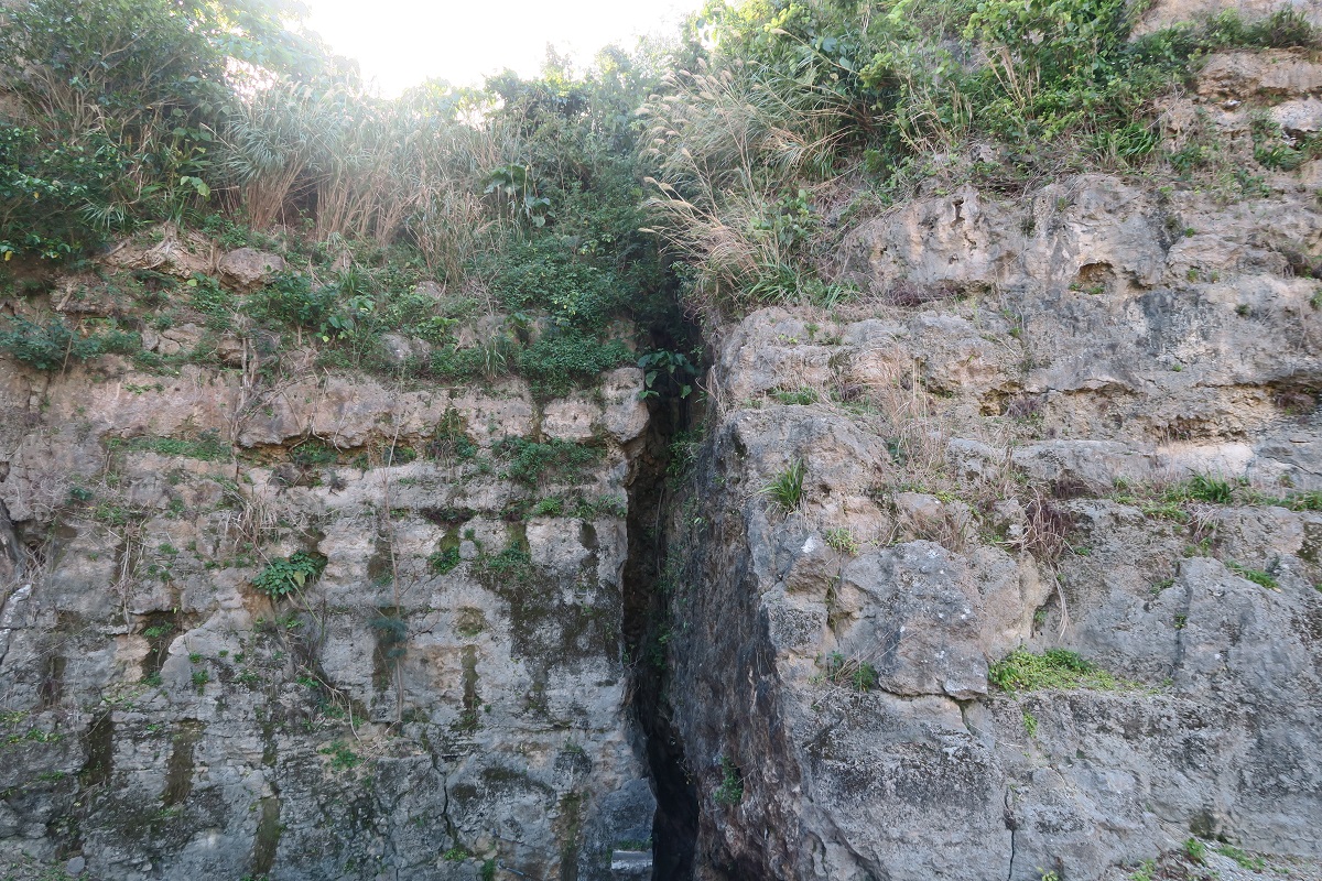 発見当初はもっと高さのある崖だったと思われます。階段を昇って崖の上に昇ってみましたが、港川人が落ちたと考えられる裂け目はわかりませんでした。