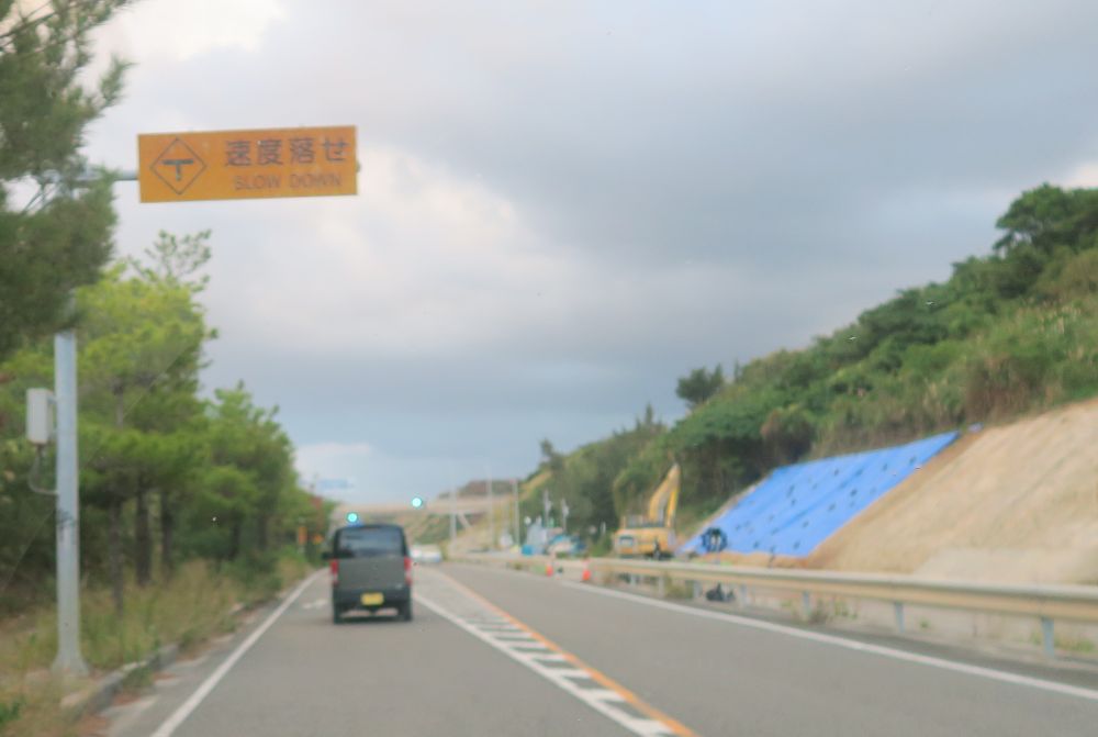 さらに国道58号線を北上し恩納村のバイパスを走ると工事車両が停まっているところがたくさんありました。たまたま工事が休みのところもあったようですが、工事が中断されたままなのに工事車両が置きっぱなしになっているところもたくさんありました。