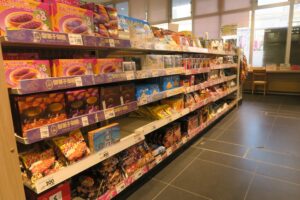 御菓子御殿松尾店の店内。オリジナルのお菓子がたくさん並びます