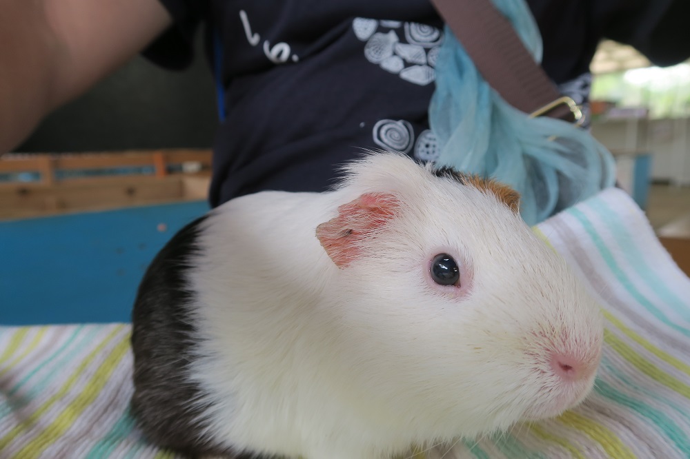 一匹だけ起きていたモルモットがいたので、抱っこして自撮りしました。