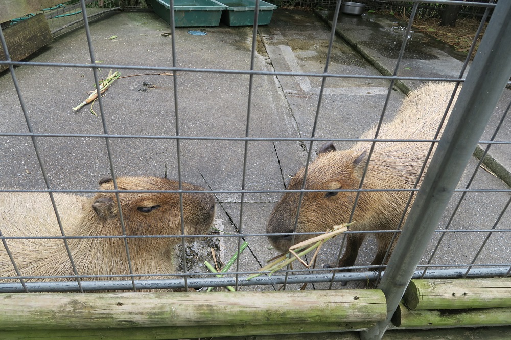 アニマルカフェを出て、園内を進んだ先に”ふれあい広場”があります。ふれあい広場には、ヤギ、リクガメ、モルモット、カピバラなどがいて、触れ合うことができます。