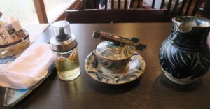 お水のピッチャーも、やちむんです。ショウガの入れ物も、おしぼりのトレイもやちむんです。良いですね。