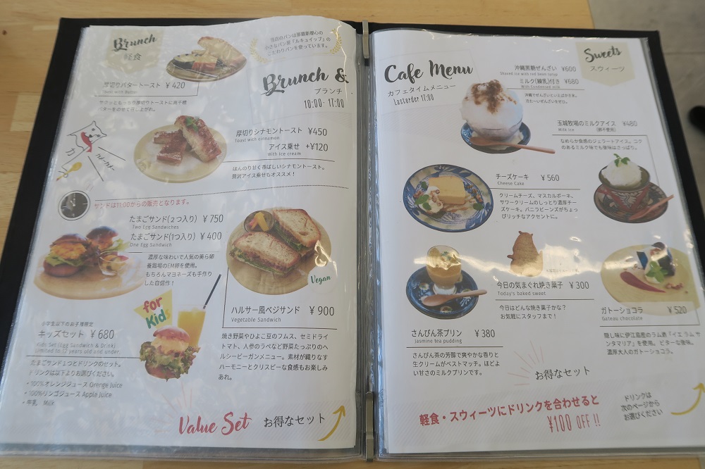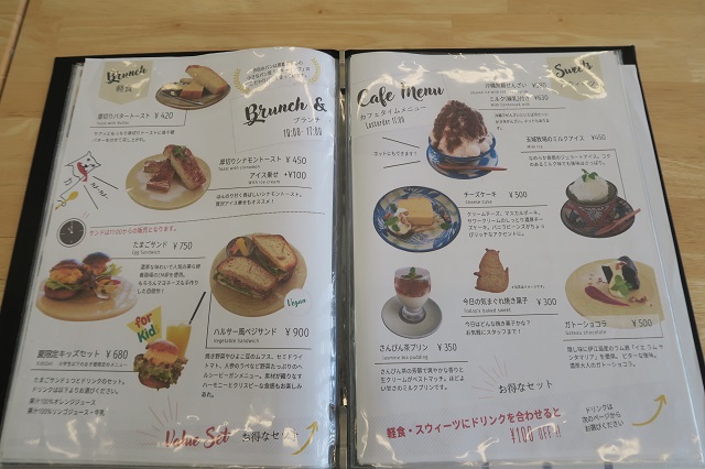 おきみゅーの2階には「カメカメキッチン」と言うカフェがあります。博物館や美術館の見学は思っている以上にたくさん歩きますので、休憩したくなりますね。