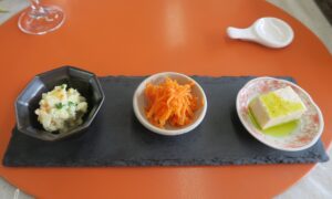 島豆腐とキャロットラペ、ポテトサラダには、それぞれ異なるオリーブオイルがかけてあります。どれも香りがとても良く、相性の良さに驚かされます。