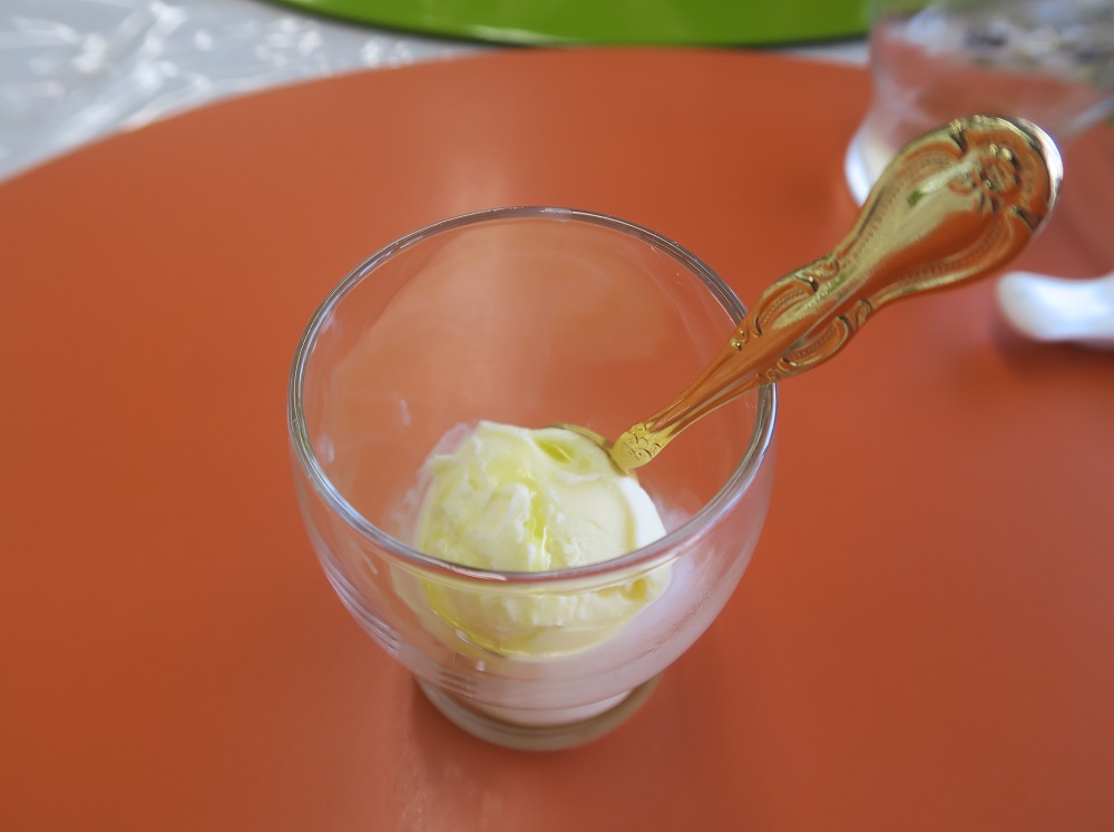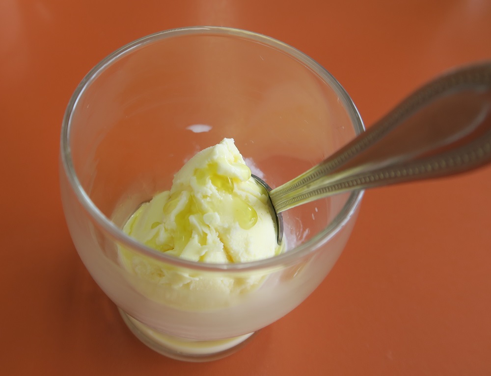 シンプルなバニラアイスがオリーブオイルで大変身しています。おいしさを再確認しました。