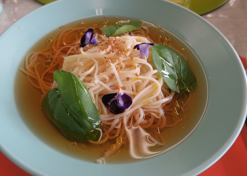 友人と2人で悩んで、「薬膳鶏だし そうめん」(1,600円)「胡麻だし つけそうめん」(1,500円)をお願いして、シェアして食べることにしました。