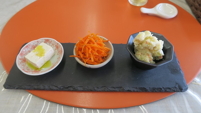 左:ポテトサラダ 中央:キャロットラペ 右:島豆腐