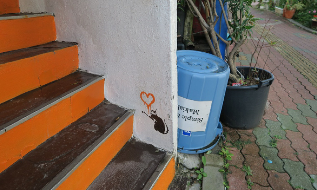 開南のバス停近くで見つけました。もしかして、バンクシー? 他の地域でも見つかったってハナシもあったような、ないような。