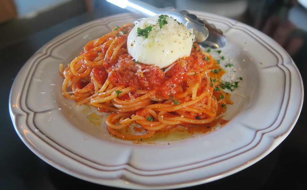 チーズがトッピングされているナポリタンです。自家製のパスタ麺はやや太め。もう少し柔らかく茹でててもいいかな。麺がトマトソースとよく絡んでいます。チーズは麺と絡まないのでもっと粉チーズがあってもいいかも。