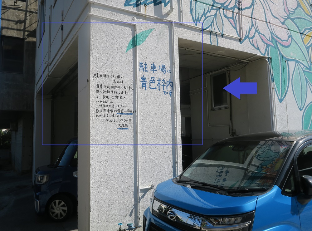 入店すると駐車した場所を問われます。青い線を確認してくださいね。