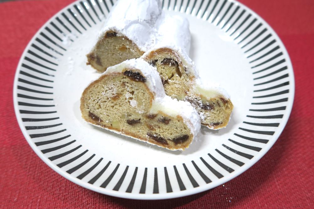 シュトーレンはまん中から切って食べると聞きました。日にちが経つにつれて味がなじんでいくので、味わいの変化も楽しむものだそうです。