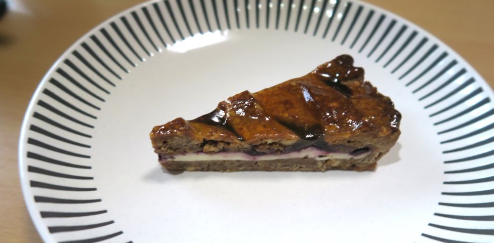 日本のケーキはふわふわタイプが多いですが、リンツァートルテはぎゅっと中身が詰まったタルトのようなケーキです。生地の中にクリームチーズと ブルーベリーソースが入っています。 ヘーゼルナッツの食感とシナモンの香りが楽しいです。