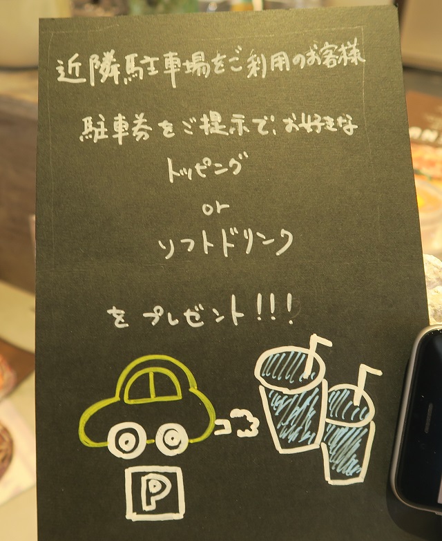 駐車券を提示すると、トッピングorソフトドリンクが貰えるサービスもあります。