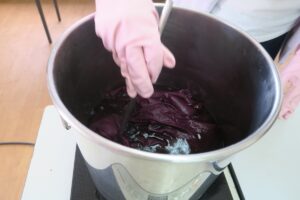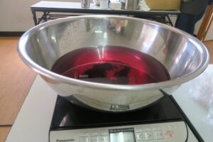 染料を火にかけハンカチを広げて入れて、80℃で30分浸します。