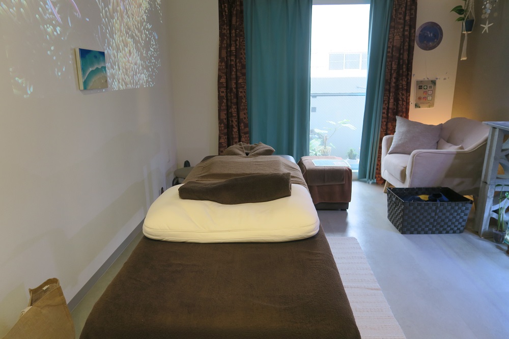ホテルの一室をリラクゼーションサロンにしてあって、お客様がリラックスできるように心が配られています。明るさ、室温、香りなど。熱帯魚の泳ぐ水槽もたくさんあって、沖縄の海を感じながら施術を受けることが出来ます。