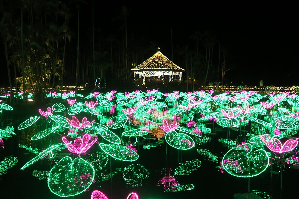 本物の蓮の花が咲く大きな池に、ひかりの蓮の花が咲き乱れています。この写真より、もっともっとキレイでした。