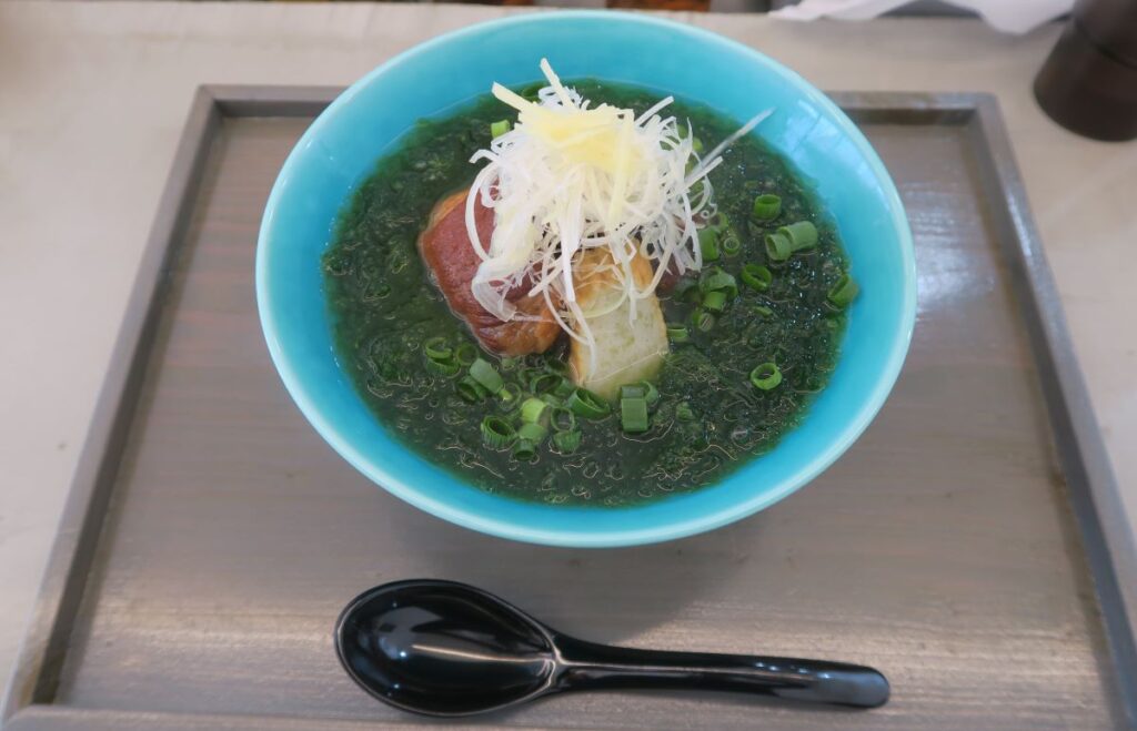 ブルーの器にたっぷり入ったアーサーの緑が映えています。スープは「STAND EIBUN」らしい、スッキリで旨味たっぷりでアーサーの塩味とのハーモニーがたまりません。