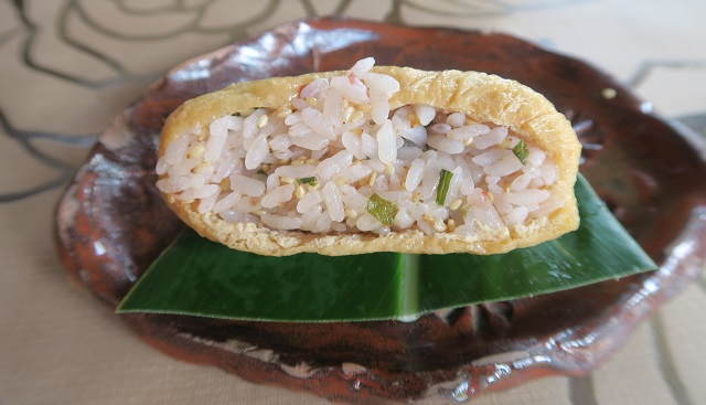 いなりはゴマが効いていて酸味が強くなく、葉物野菜?が混ぜてあり、他にはない味でおいしかったです。