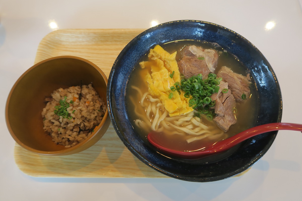麺は縮れ麺なのでスープがよく絡みます。軟骨ソーキはスープの味を妨げないような味付けで柔らかく煮込まれています。トッピングがネギと卵焼きっていうのも面白いですね。スープを吸った卵焼きが嬉しいですね。
