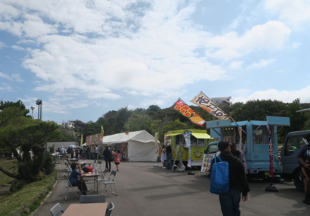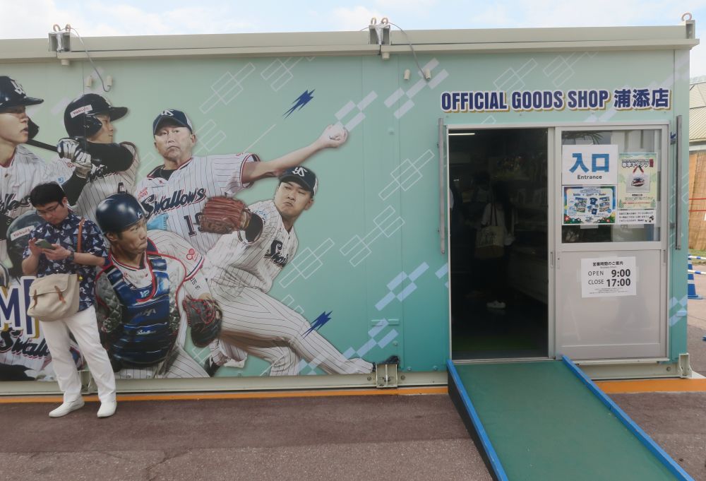 私達の目的はヤクルト対ロッテの練習試合でした。球場のすぐそばにキッチンカーなどの飲食ブースとグッズショップがまとまってあるのがいいですね。