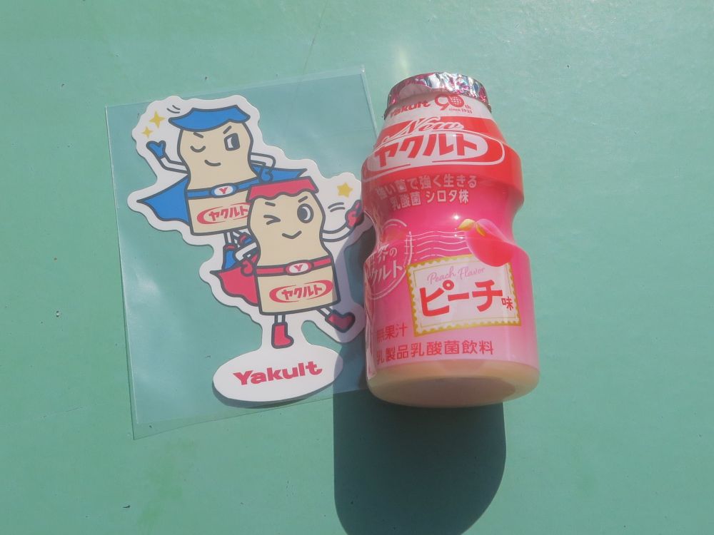 入口のところでヤクルト(ピーチ味)とヤクルトマンのステッカーを貰いました。