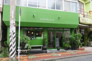 ひときわ目立つ緑色の外観が特徴の「SABORAMI(サボラミ)」。ガラスの引き戸を開けて店内に入ると、左側に厨房とカウンター席、右側にテーブル席とソファ席があります。