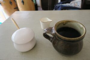 コーヒーは「たそかれ珈琲の豆」って書いてありますが、SABORAMIから歩いて10分くらいのところにある「たそかれ珈琲」はマスターの実の弟さんのお店なのです。「たそかれ珈琲」で焙煎したコーヒー豆を使っているんですね。