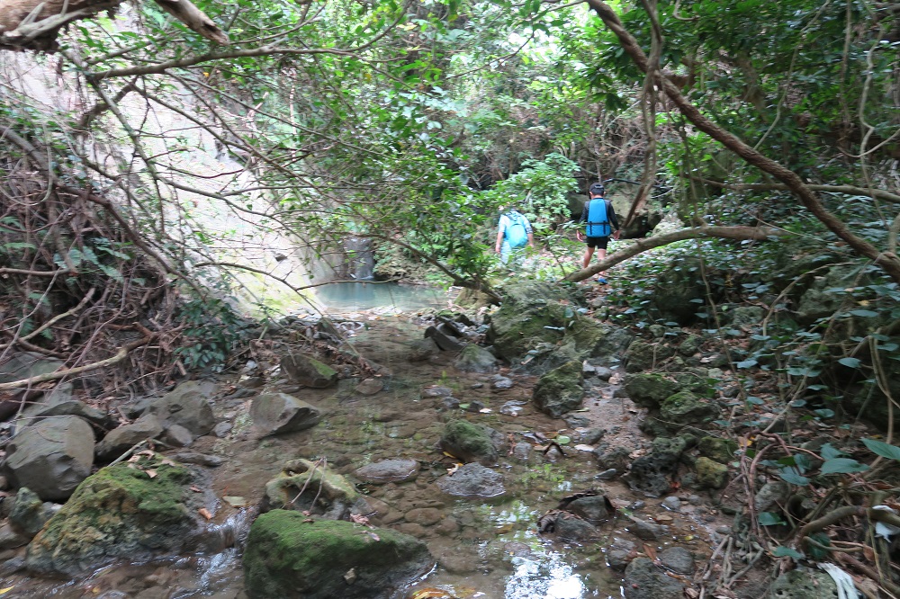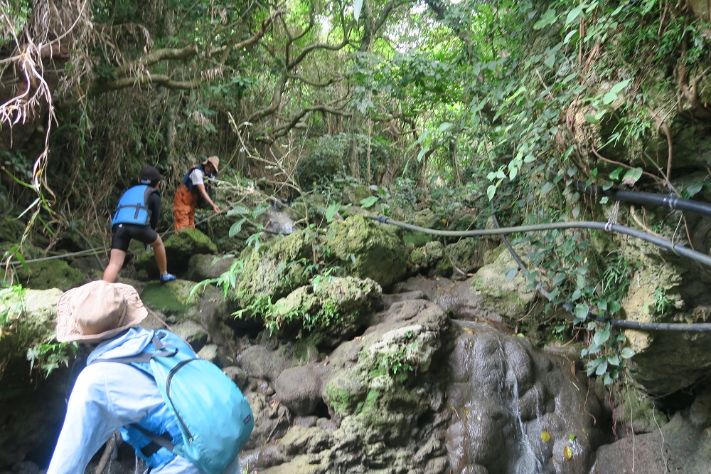 岩を登ったり、沢にひざ下くらいまでつかったりしながら進みます。申し込んだ際に、マリンシューズが必須アイテムと言われていましたが、マリンシューズでも滑ります。