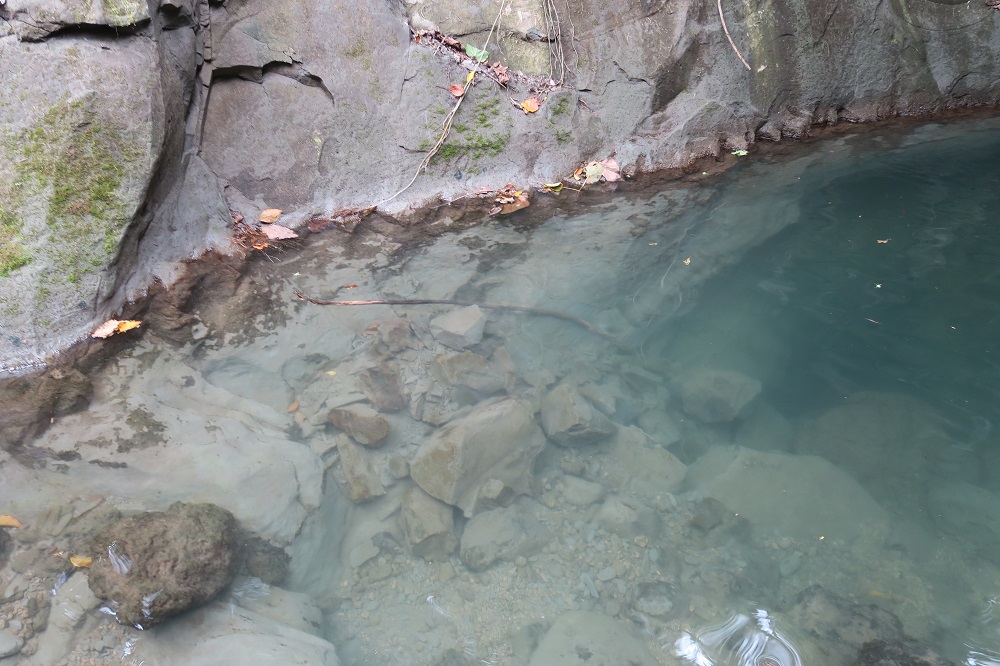 この池周辺の地層が異なるのがお判りいただけるでしょうか?ここは泥岩で、”くちゃ”が採れます。”くちゃ”は肌に良いと言われていて、パックなどの材料に使われています。