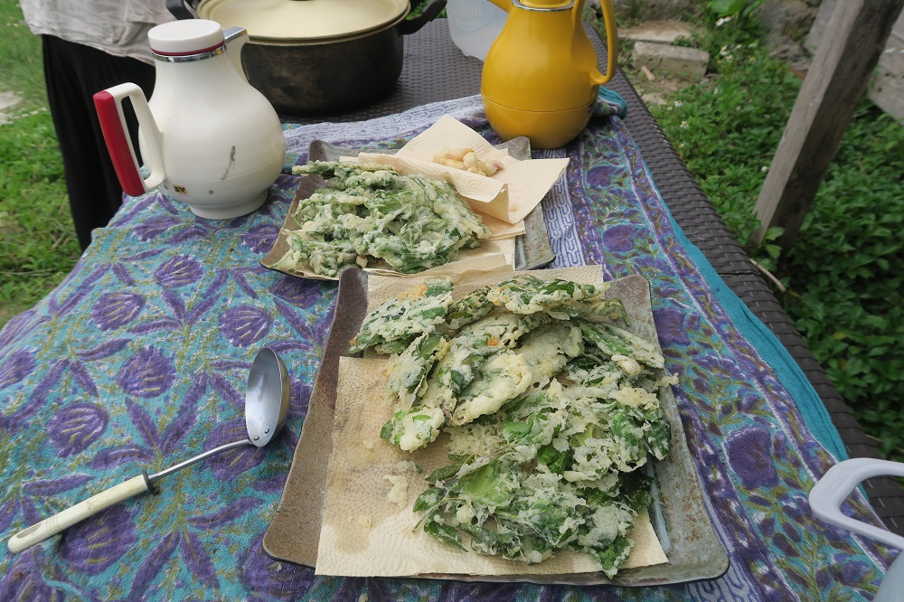 フーチーバ(よもぎ)を摘んで天ぷらに揚げてくださいました。月桃の花も天ぷらにしています。豚汁も作ってくださいました。