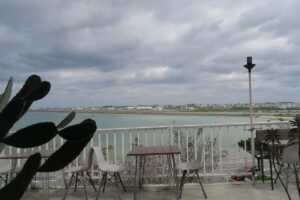窓際の席からの眺めです。目の前の海は泳げませんが、ウィンドサーフィンなどが楽しめます。