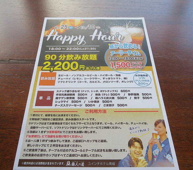 ”湯上りビールで乾杯”のチラシを見て、私たちは吸い込まれました(笑)